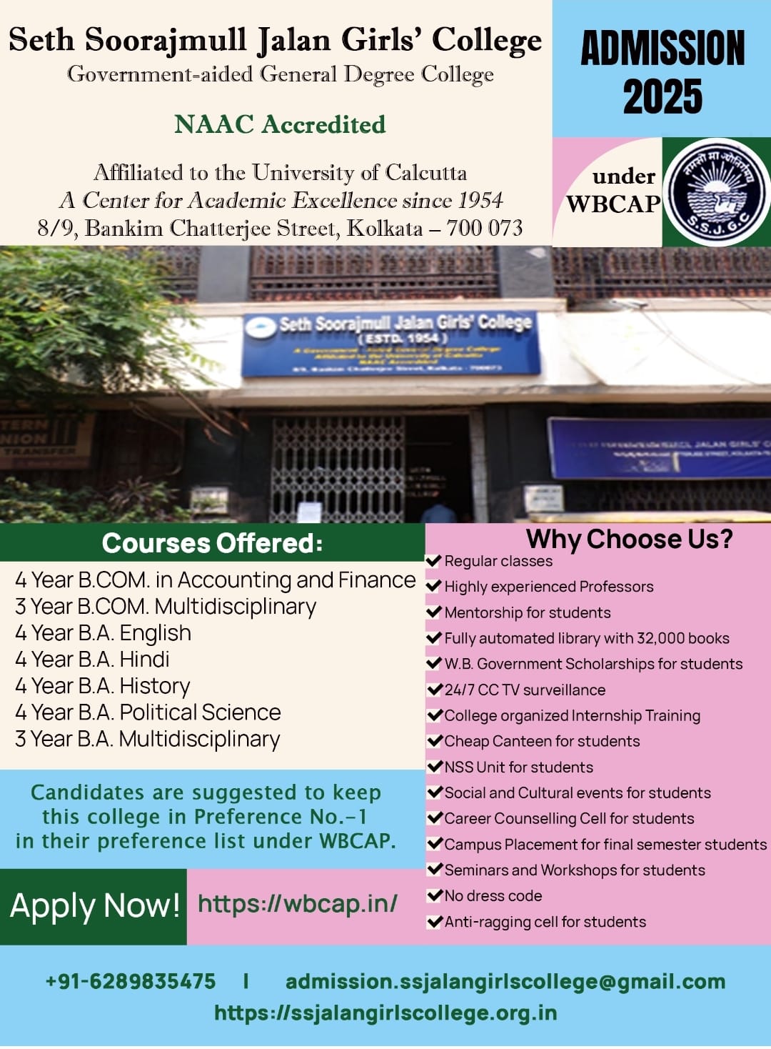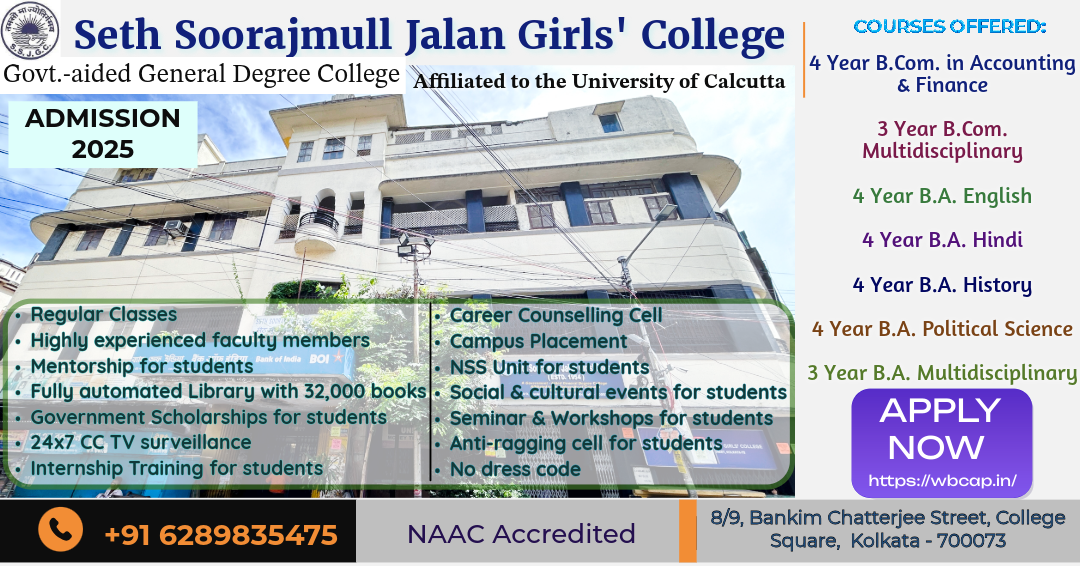 It is a college affiliated to the University of Calcutta and follows the rules and regulations, curriculum designing and system of examination and evaluation set by the university. The college is presently offering UG Courses under Curriculum and Credit Framework 2022 (CCF-2022) as well as ongoing three year Bachelor Degree (Honours & General) courses under CBCS examination system in various disciplines of Humanities & Commerce. College Hours: 7:30 am - 2 pm. Medium of instruction: English.