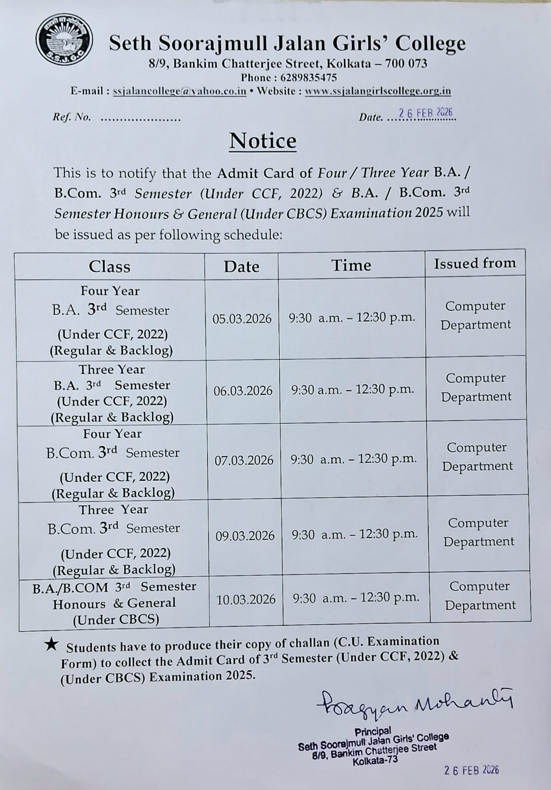 Notice for Issue of Admit Card of B.A. & B.Com 3rd Semester Examination 2025(Under CCF & CBCS)