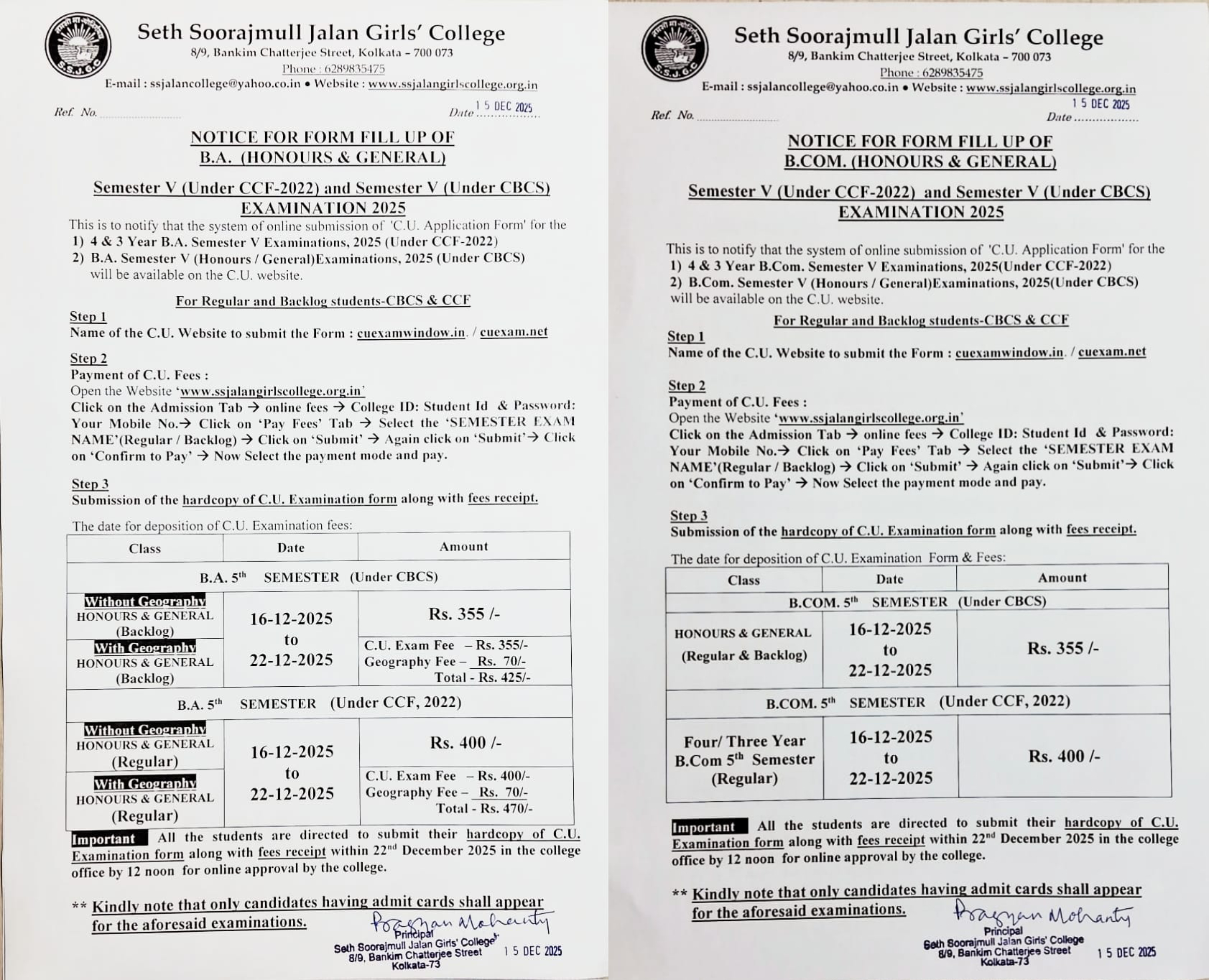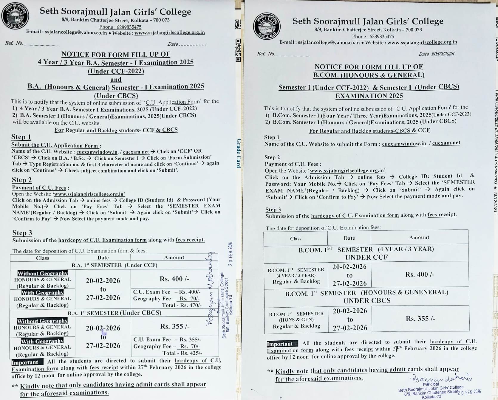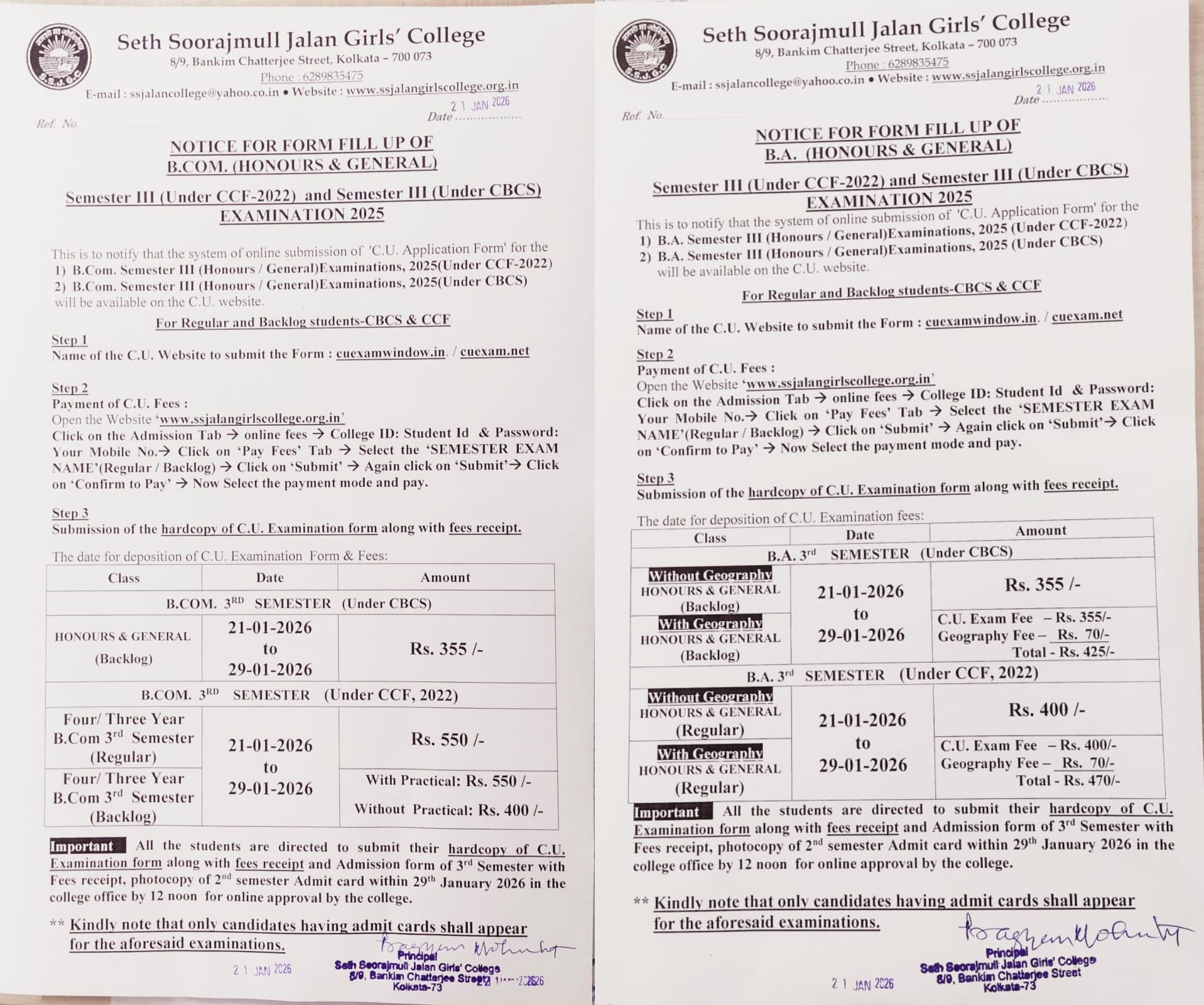 Notice for form fill up of B.Com. & B.A. Semester I (CCF & CBCS) Examination 2025